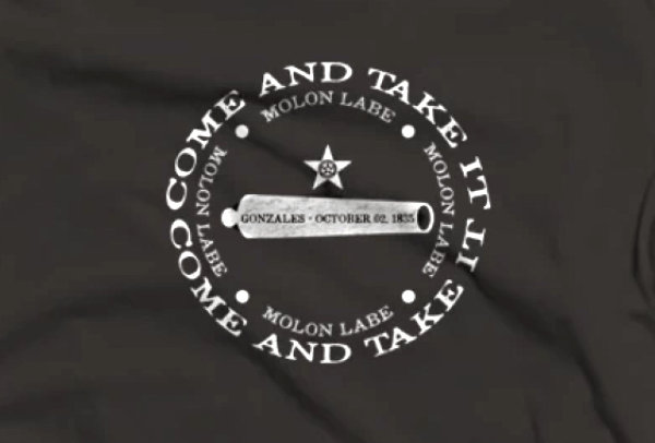 Last year a dunce of a professor at UT San Antonio called Come and Take It, “a slogan that embodies both anti-Mexican and pro-slavery sentiments.” Last week, an FBI document came to light which calls “Come and Take It” and the famous cannon symbols of “Militia Violent Extremism.” This is sad and infuriating. It’s also evidence we are not doing a bang-up job of educating people about Texas history. Ask around. You will find that most can’t tell you what the call “Come and Take It” is about the Battle of Gonzales. That it’s about how colonists stood up to a government trying to disarm them. That it set in course a chain of events that led to a free and independent Texas. We made it obvious by placing “Gonzales – October 02, 1835” on the cannon. Now, if anyone asks about the date…, you can give them a little history lesson. For those unfamiliar, “MOLON LABE” is Greek for “Come and Take It.” It was the battle cry of the three hundred Spartans at the Battle of Thermopylae. Their story inspired the men who stood their ground at Gonzales. People knew history back then.